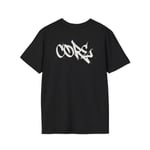 - DTG/DTF printed graphics: bold graffiti print on chest, back and printed inner neck label